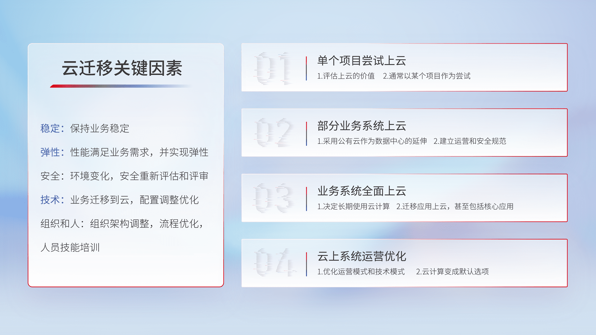 结合实际业务,,,从规划设计、、云平台选型、、云原生改造、、数据迁移、、集成交付,,迁移全过程为客户识别最佳上云路径,,,,做好风险识别管理,,,设计网络架构、、、、身份权限、、安全审计合规、、、操作审计、、日志审计、、、监控告警策略、、多站点容灾设计等,,,对云上基础设施进行整体规划,,,提升IT治理水平,,以满足弹性、、、高可用、、高性能的需求。。。。
