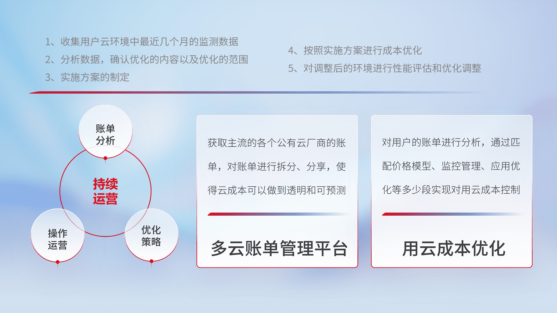 通过多云纳管,,,,以统一的资源数据模型把客户的云资源进行抽象和封装,,,,进而实现对多云资源的统一操作,,保障云资源管理的可靠性、、稳定性与可用性。。量身定制化运维内容,,,配置、、、开发运维、、、、补丁管理、、、备份、、、、监控、、认证和访问管理、、审计和日常巡检等,,,保障在用云过程中的可靠度,,稳定度以及高可用率。。。